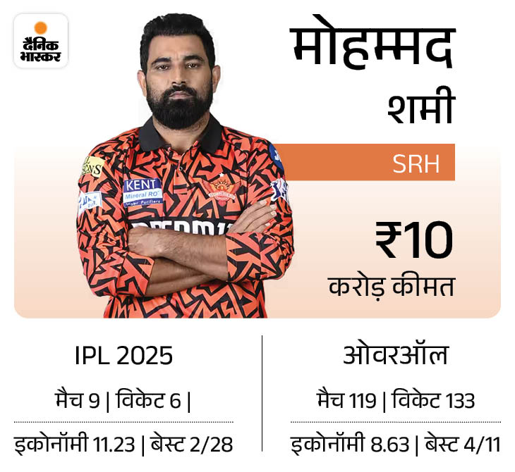 तेज गेंदबाज मोहम्मद शमी को सनराइजर्स हैदराबाद ने 10 करोड़ रुपए में खरीदा। हालांकि, 9 मुकाबलों में वे 6 विकेट ही ले सके। उनकी इकोनॉमी भी 11 से ज्यादा की रही। शमी IPL में 133 विकेट ले चुके हैं, लेकिन पिछले एक साल से आउट ऑफ फॉर्म हैं।