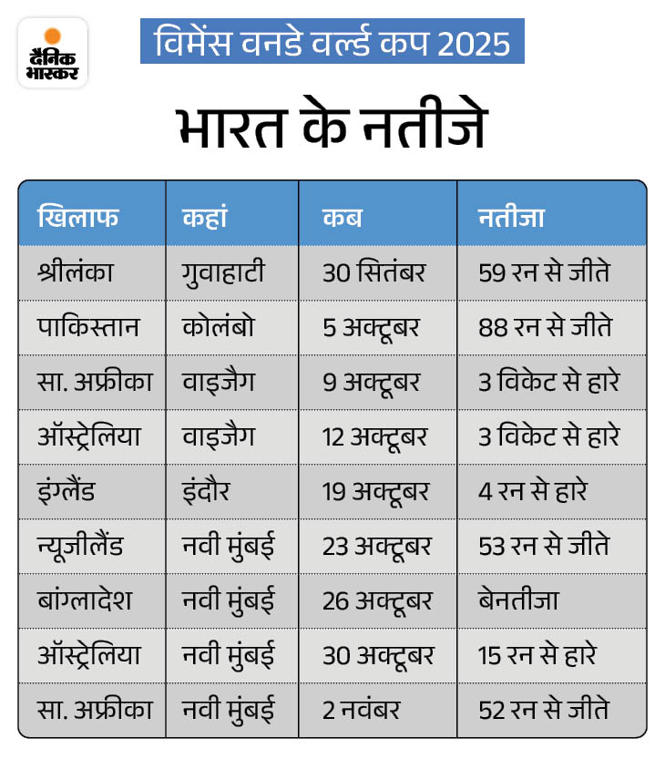 भारतीय टीम ने 2 नवंबर को नवी मुंबई में खेले गए फाइनल मुकाबले में साउथ अफ्रीका को 52 रन से हराकर खिताब जीता था।