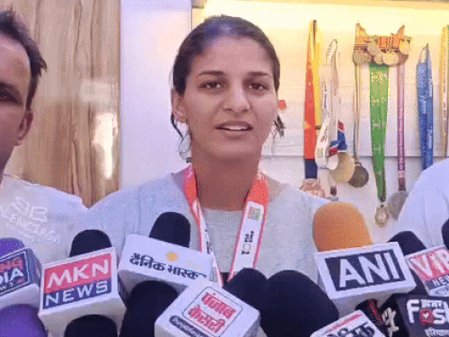 मुक्केबाज जैस्मिन लंबोरिया घर पहुंचने के बाद जानकारी देती हुई।