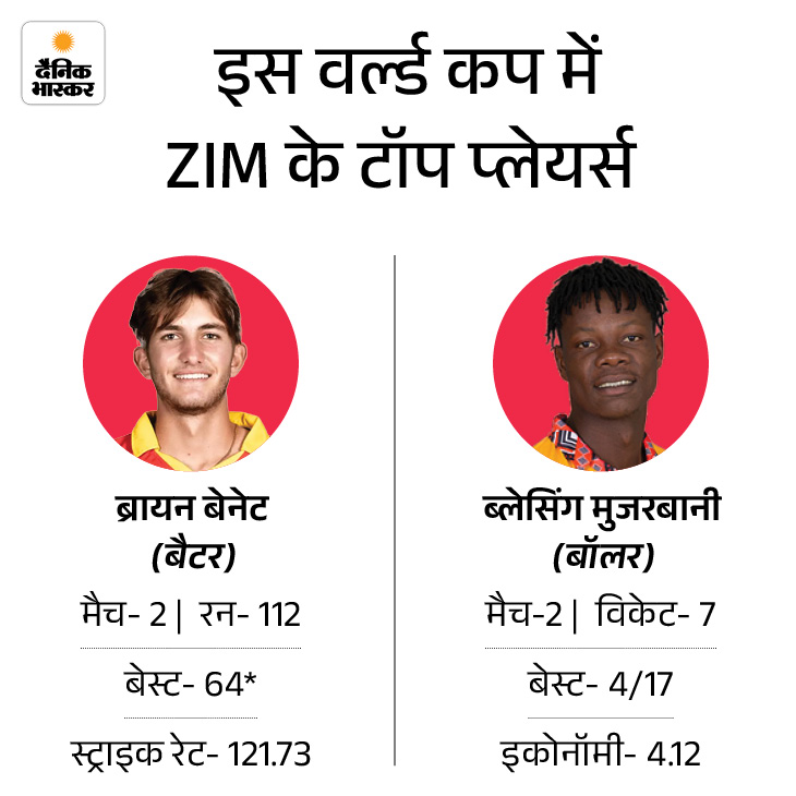 ब्रायन बेनेट और गेंदबाजों का शानदार फॉर्म जिम्बाब्वे की इस कामयाबी में उनके टॉप ऑर्डर बल्लेबाज ब्रायन बेनेट और तेज गेंदबाजों की बड़ी भूमिका रही है। बेनेट ने ओमान के खिलाफ नाबाद 48 और फिर ऑस्ट्रेलिया के खिलाफ नाबाद 64 रनों की पारी खेलकर टीम को संभाला है। वह टूर्नामेंट के टॉप रन स्कोरर हैं। उन्होंने अब तक खेले 2 मैचों में 121.73 की स्ट्राइक रेट से 112 रन बनाए हैं। वहीं, गेंदबाजी में ब्लेसिंग मुजरबानी, और ब्रैडली इवांस अब तक घातक साबित हुए हैं। मुजरबानी ने दो मैचों में 7 और इवांस ने 6 विकेट चटकाए हैं। ओमान को उन्होंने महज 103 रनों पर ढेर कर दिया था।
