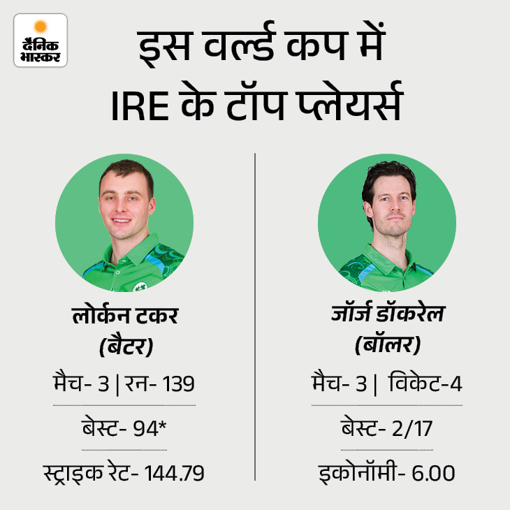 आयरलैंड के लिए बुरी खबर यह है कि उनके नियमित कप्तान पॉल स्टर्लिंग घुटने की चोट के कारण पूरे टूर्नामेंट से बाहर हो गए हैं। उनकी जगह कप्तानी कर रहे लोर्कन टकर ने ओमान के खिलाफ 51 गेंदों में 94 रनों की तूफानी पारी खेली थी। आयरलैंड ने उस मैच में 235 रन बनाए थे,जो इस वर्ल्ड कप का सबसे बड़ा स्कोर है। आयरलैंड की ओर से लोर्कन टकर टॉप रन स्कोरर हैं। उन्होंने अब तक खेले 3 मैचों में 144.79 की स्ट्राइक रेट से 139 रन बनाए हैं।